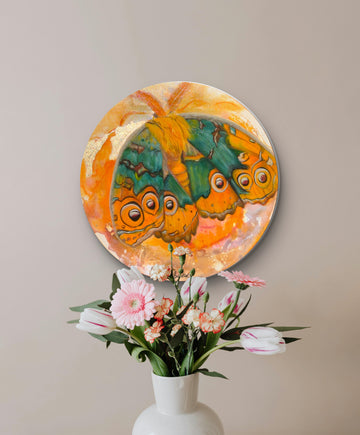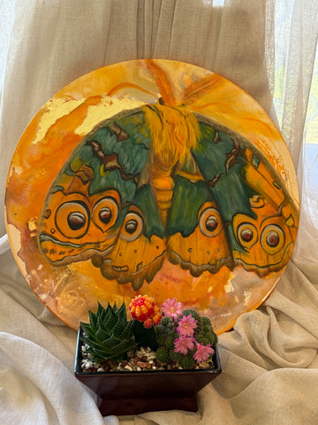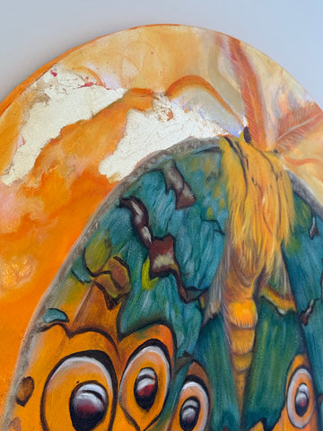 This captivating painting features a majestic moth with rich hues of turquoise, amber, and gold. The piece shimmers with intricate detail and metallic accents, evoking a sense of wonder and celestial beauty. The swirling background adds warmth and depth, making it a striking statement piece for any space.