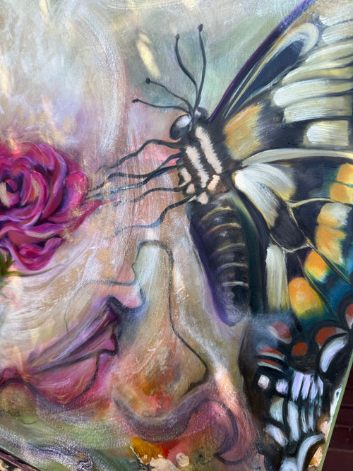 $500.00This captivating painting features a majestic moth with rich hues of turquoise, amber, and gold. The piece shimmers with intricate detail and metallic accents, evoking a sense of wonder and celestial beauty. The swirling background...