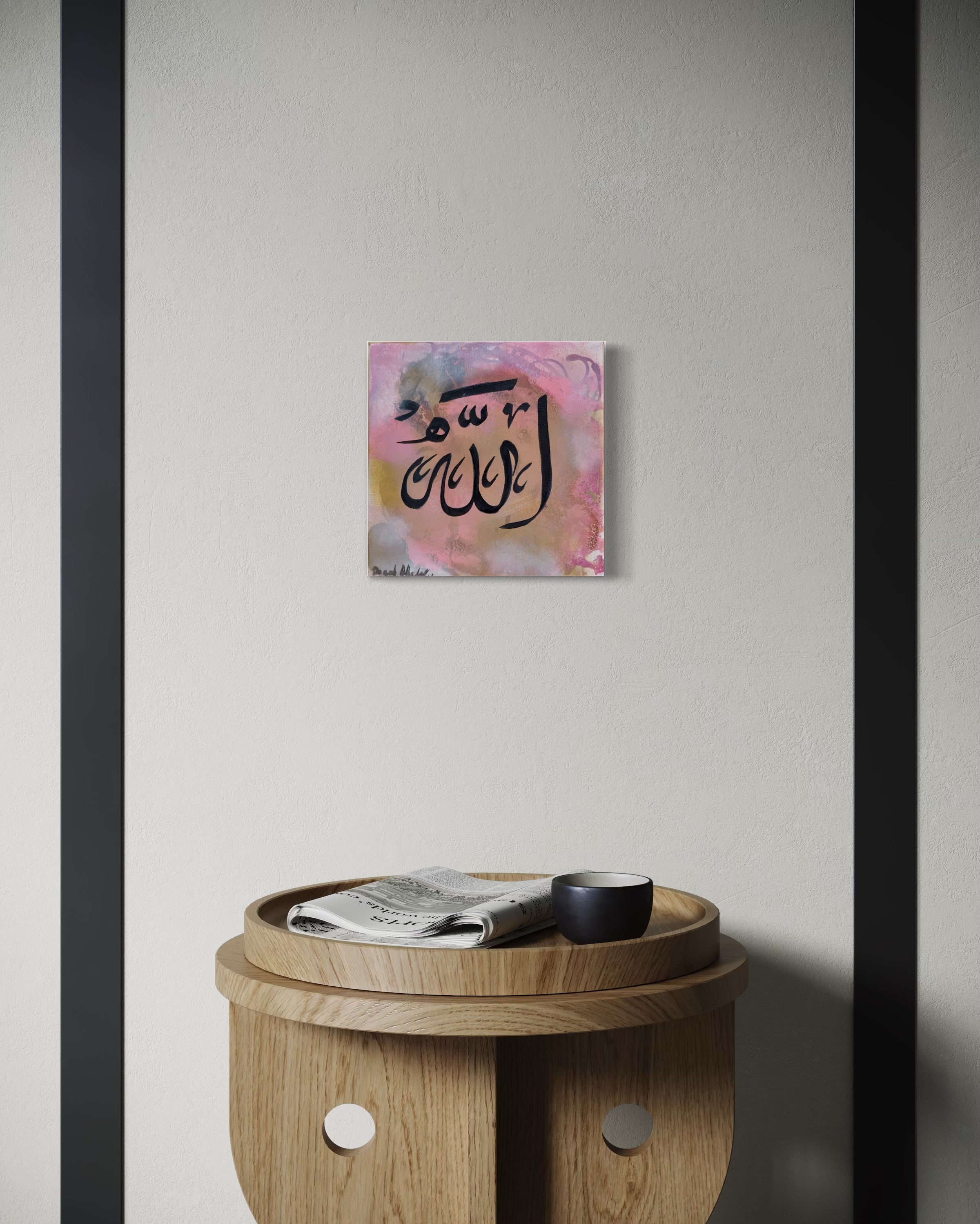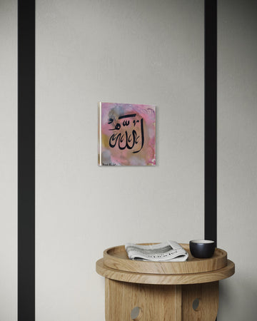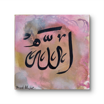 Part of a trio of miniatures, this piece centres the sacred name Allah in flowing calligraphy against a soft, ethereal backdrop. Gentle hues of rose, gold, and smoke swirl like whispered prayers, making this painting a quiet yet powerful reminder of divine presence in even the smallest of spaces.