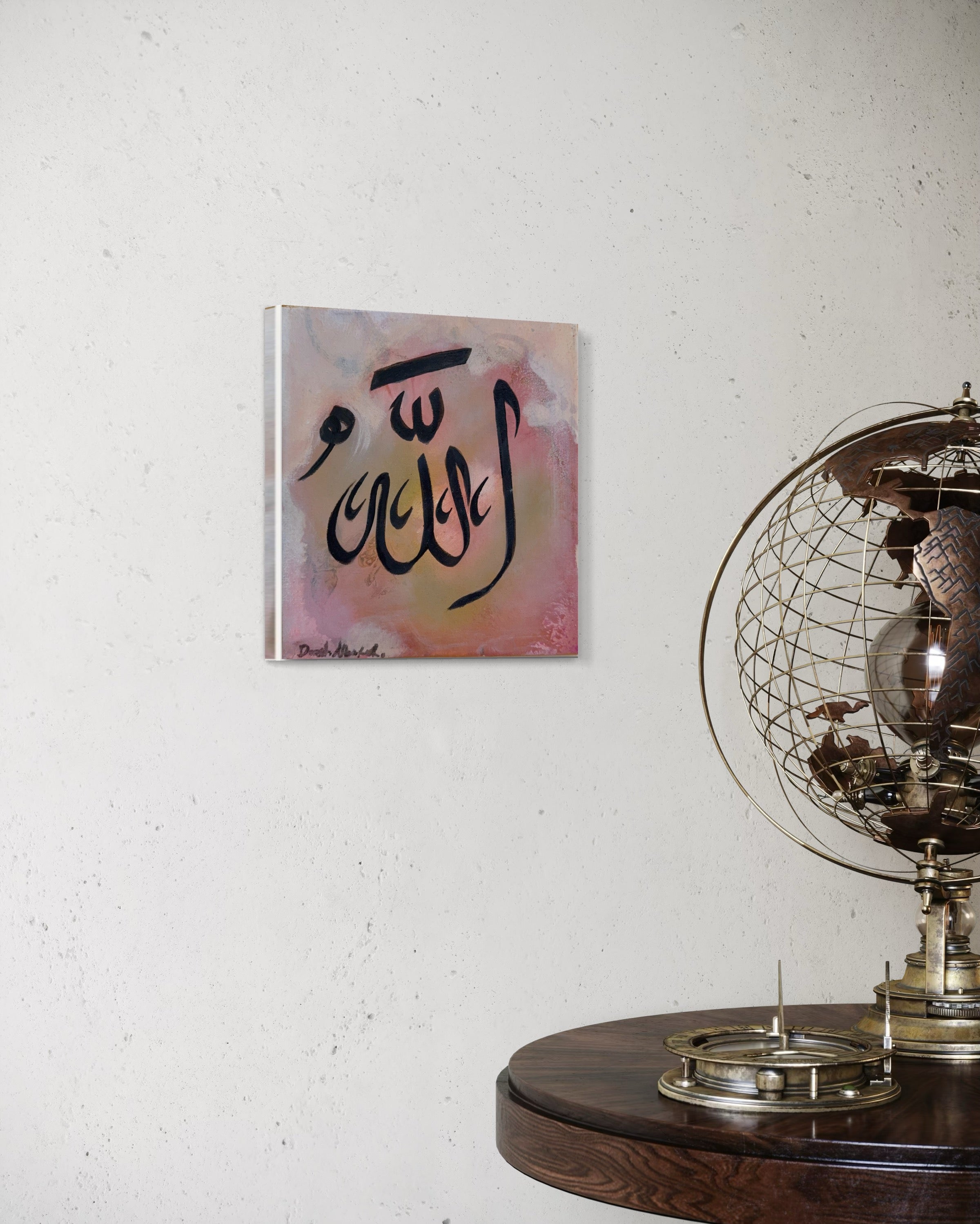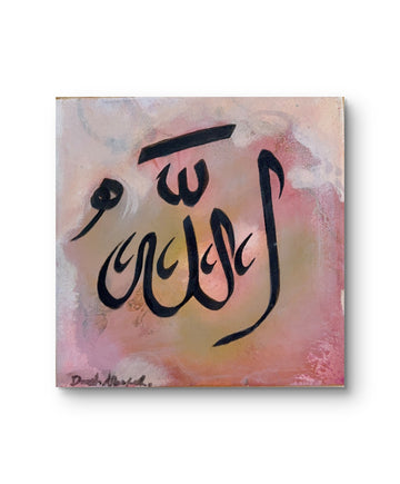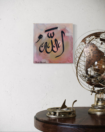 Part of a delicate trio of miniatures, this piece centres the sacred name Allah in flowing calligraphy against a soft, ethereal backdrop. Gentle hues of rose, gold, and smoke swirl like whispered prayers, making this painting a quiet yet powerful reminder of divine presence in even the smallest of spaces.