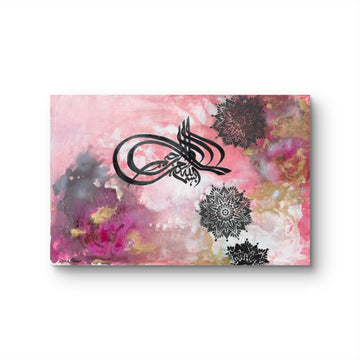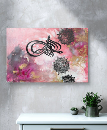 Swirling through shades of rose, gold, and clouded smoke, this painting centres the divine phrase Bismillah ir-Rahman ir-Rahim; “In the name of God, the Most Gracious, the Most Merciful.” Sacred calligraphy weaves through soft blooms and geometry, inviting peace, purpose, and presence with every glance.