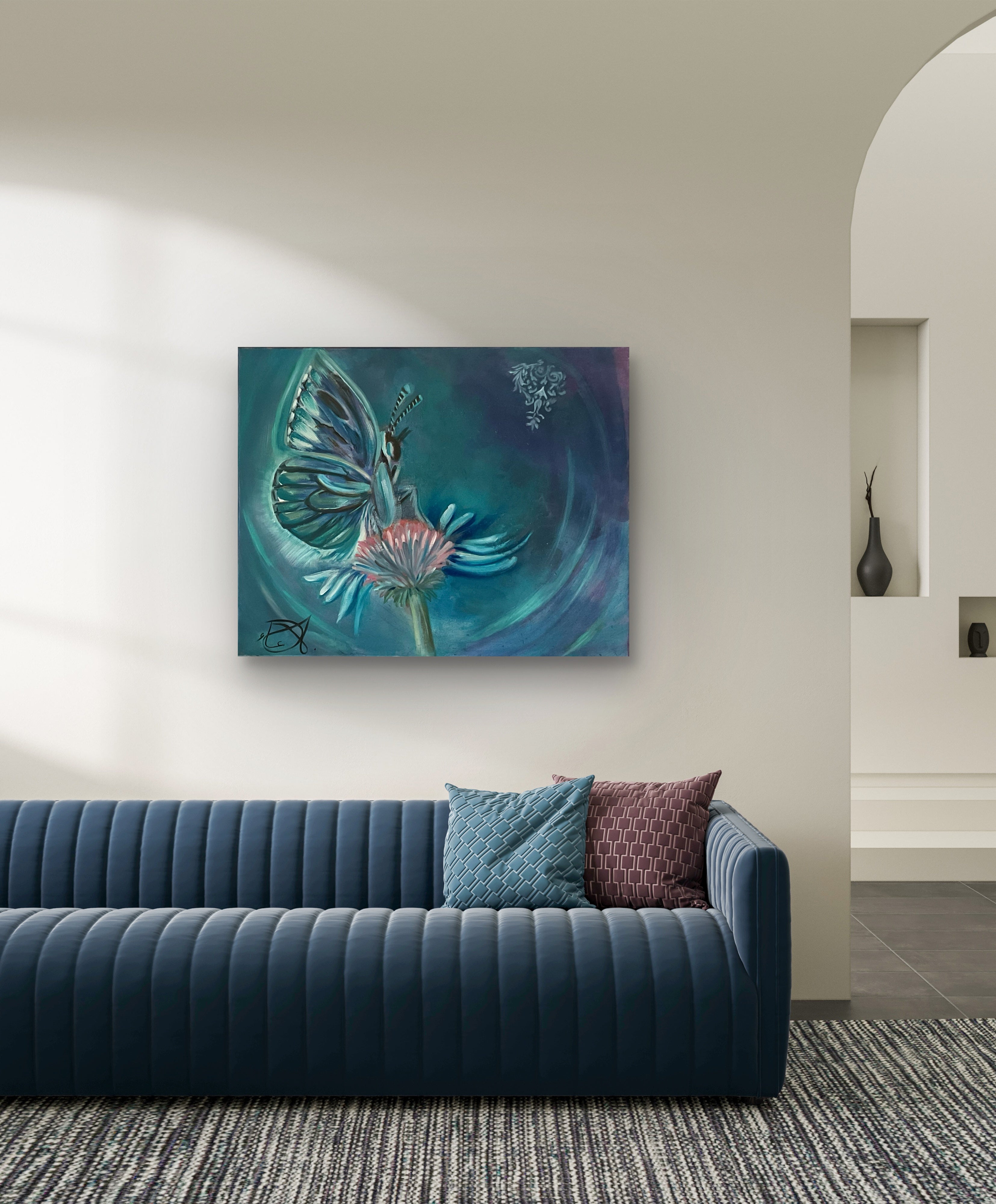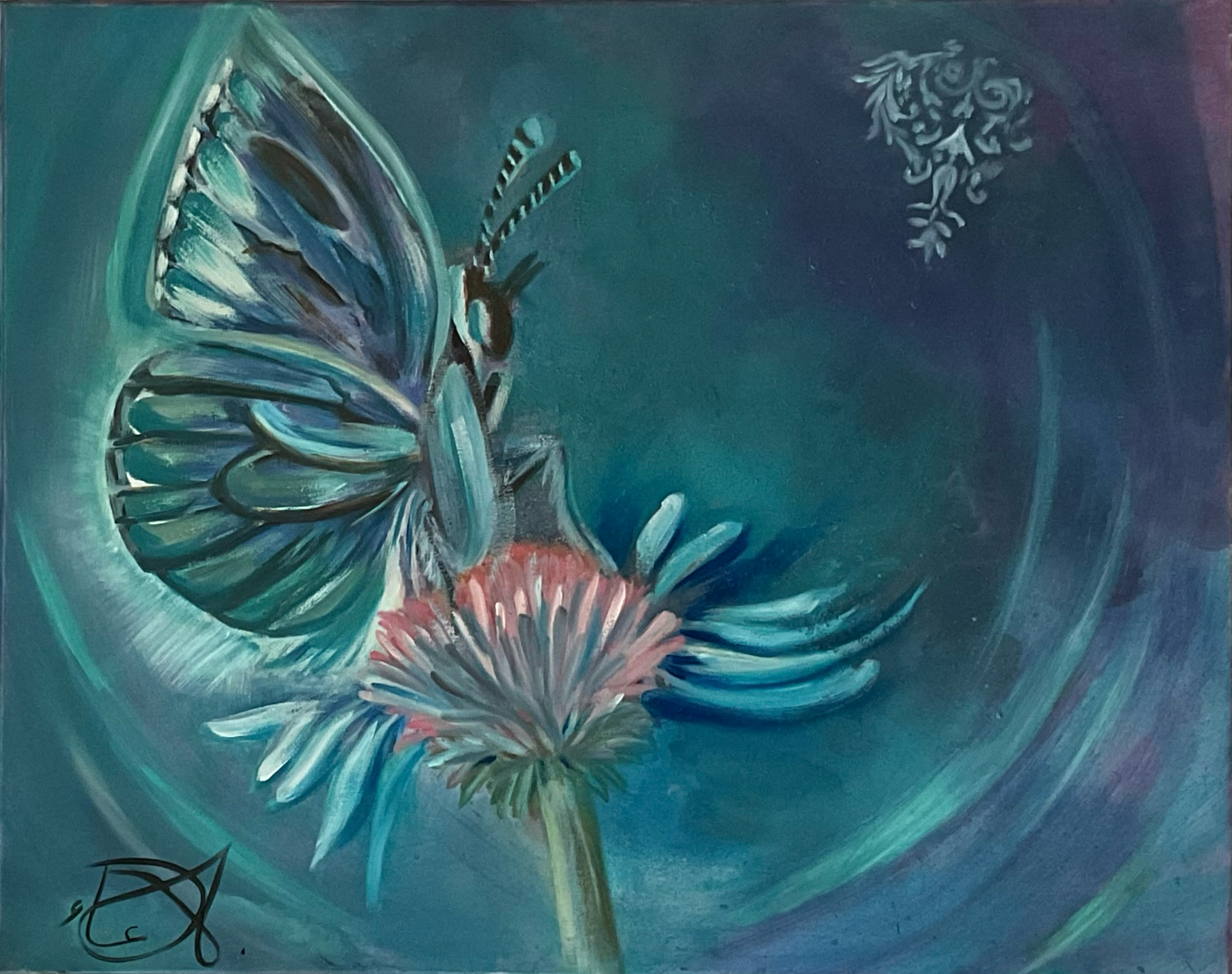 Bathed in cosmic hues of violet and blue, Stardust Wings captures a delicate fairy-like butterfly mid-pollination, merging the mystique of the stars with the quiet beauty of Earth’s bloom.