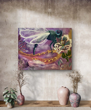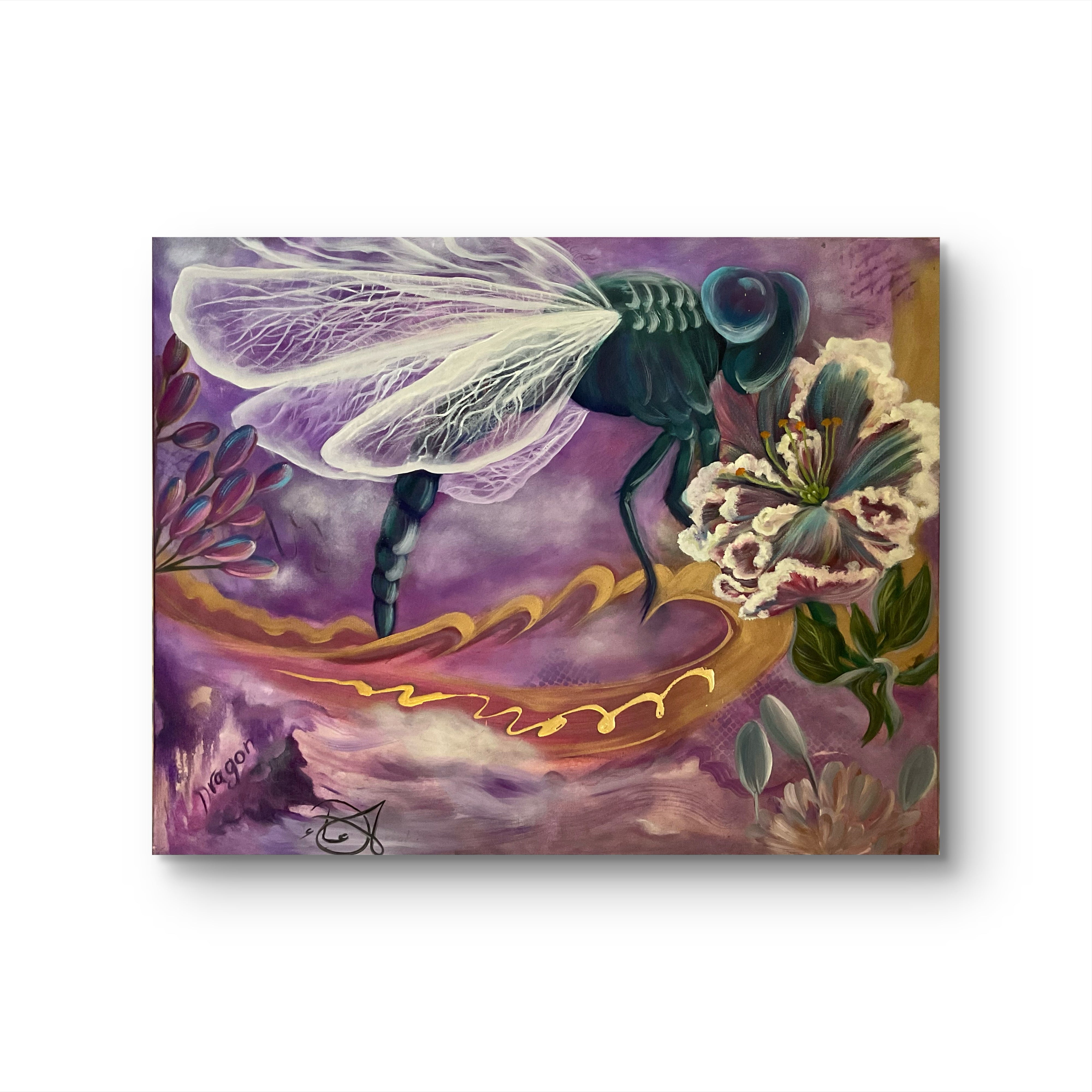 In the delicate dance of wings and petals, nature reminds us that beauty is found in the smallest moments. This captivating painting from the Earthly Fairies Collection showcases the graceful presence of a dragonfly hovering near a blooming flower in hues of soft lavender, deep violet, and golden accents. The dragonfly is rendered with intricate detail, its translucent wings shimmering with ethereal light.