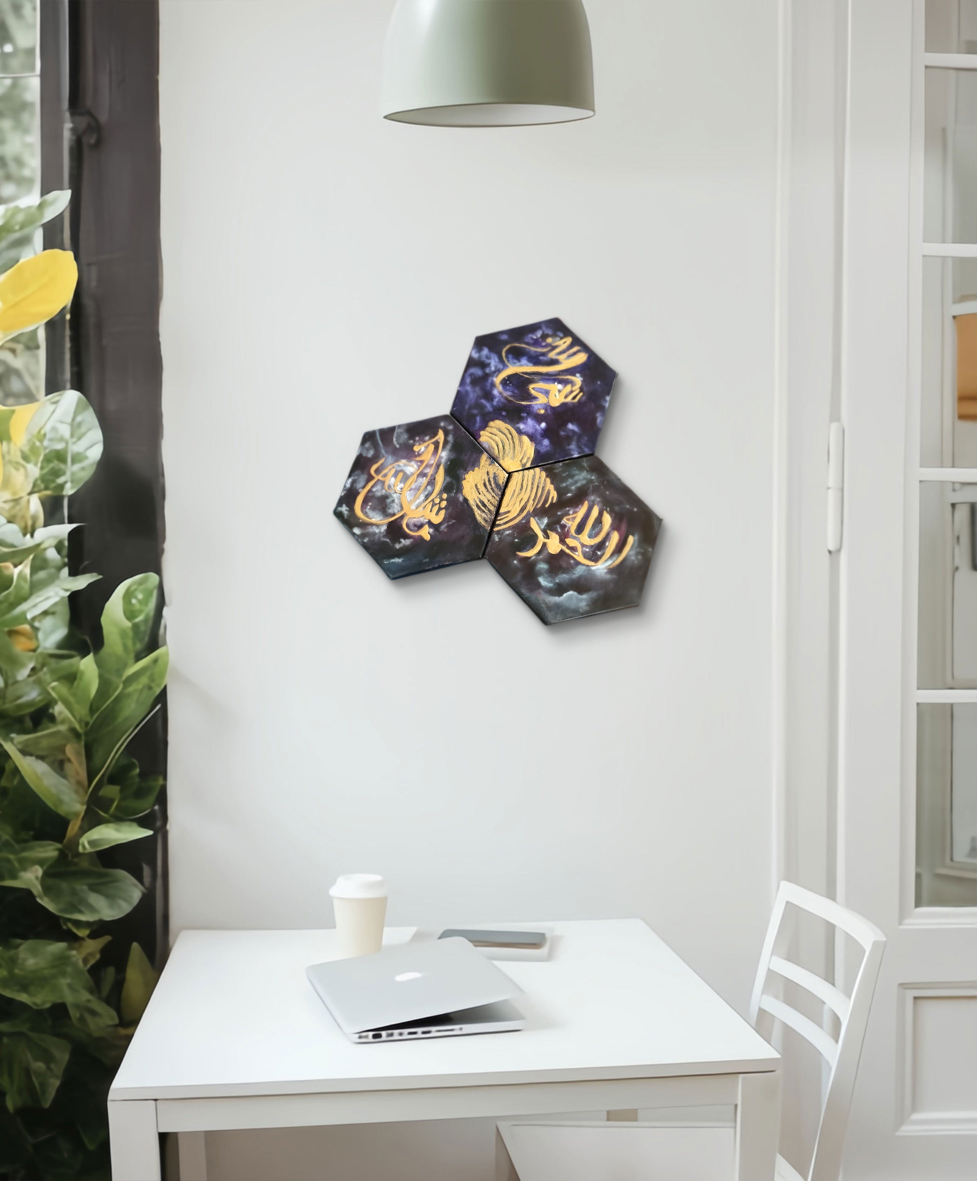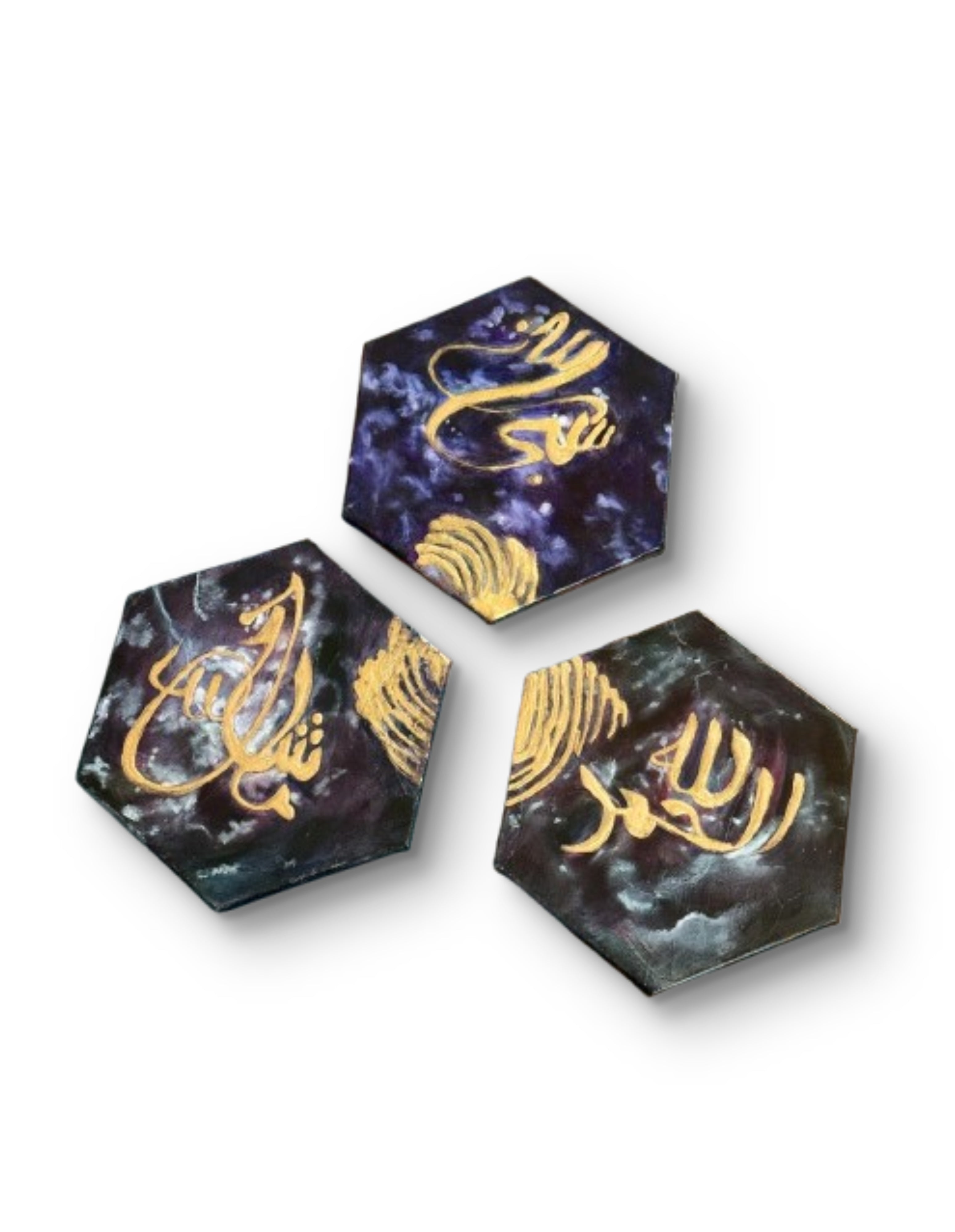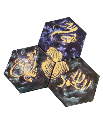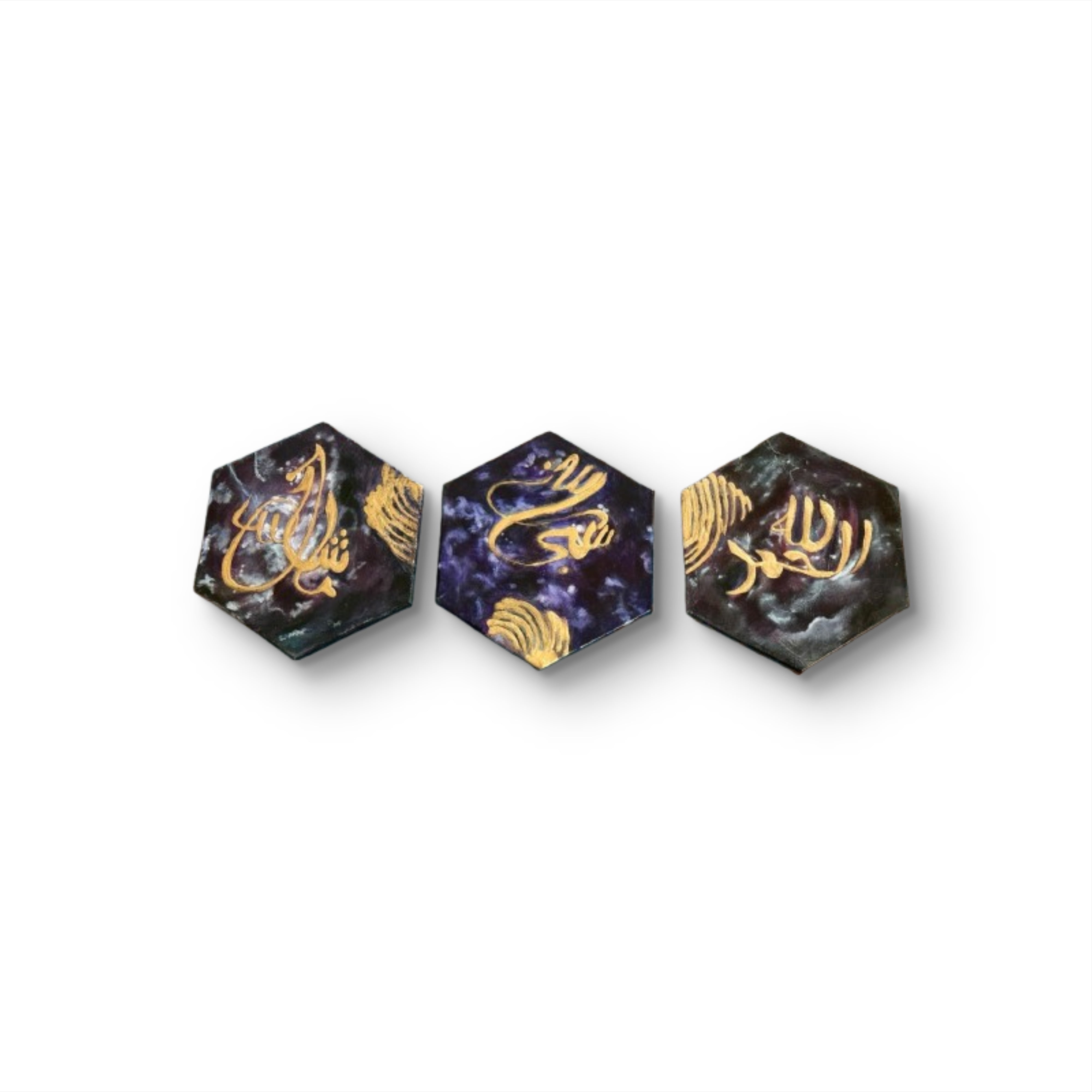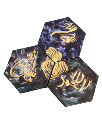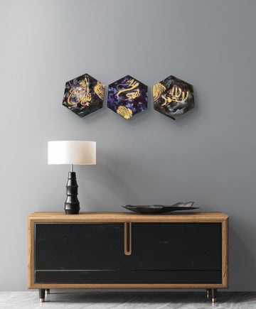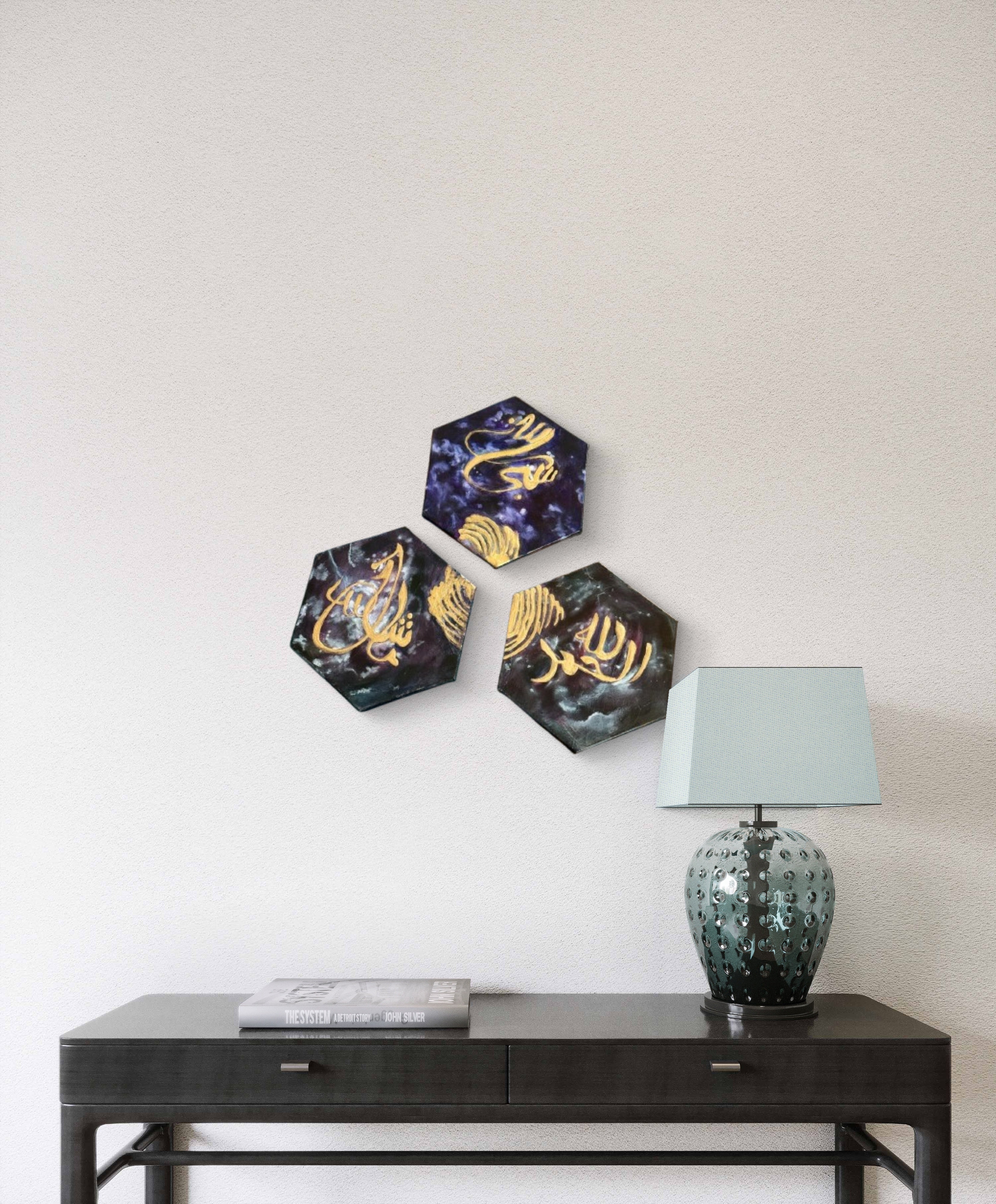 Each hexagonal piece showcases a golden, hand-painted inscription on a cosmic background of deep purples, blues, and black, reminiscent of the night sky. Accented with shimmering metallics and abstract textures, the triptych evokes a sense of spirituality, divine connection, and the vastness of the universe.