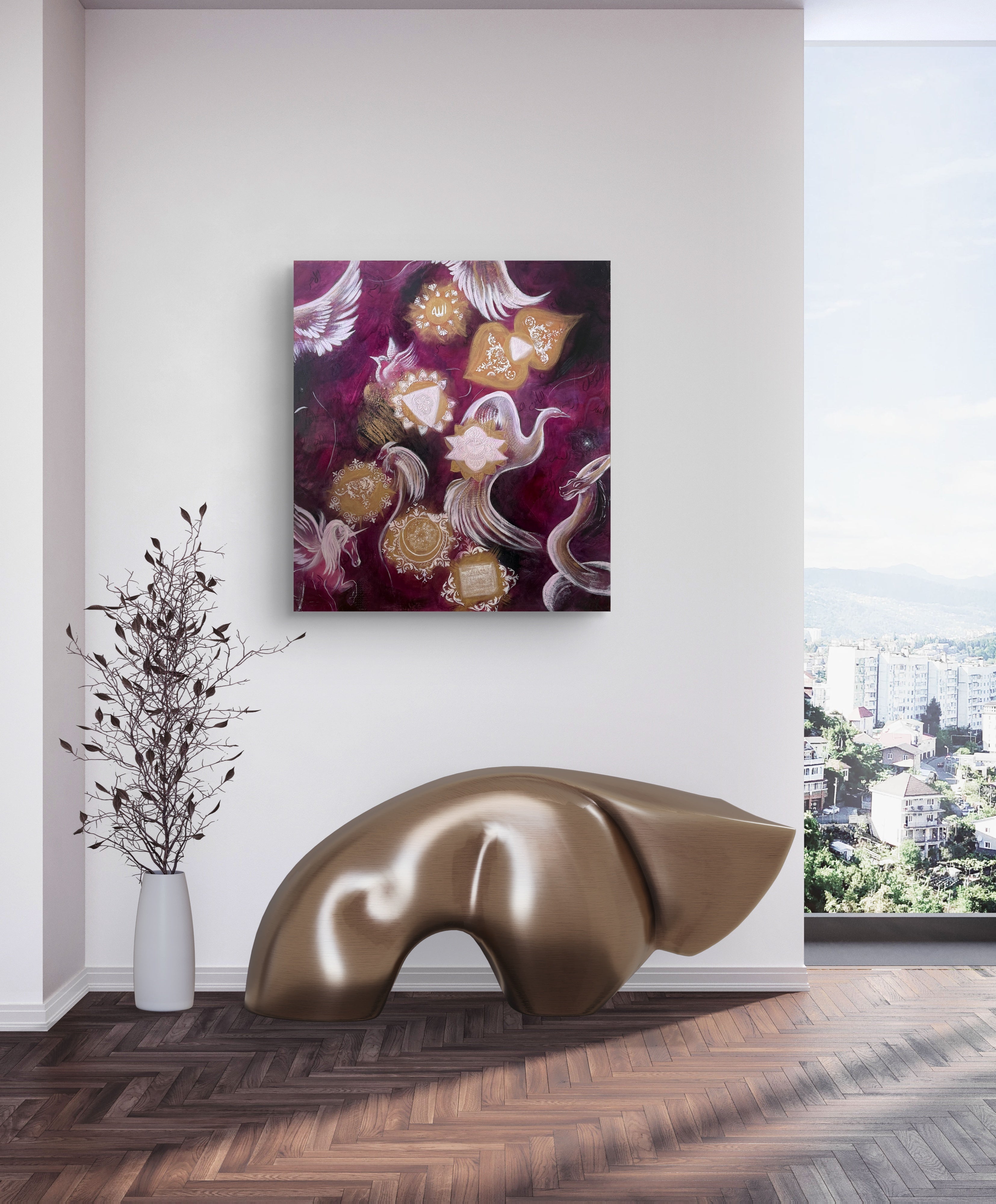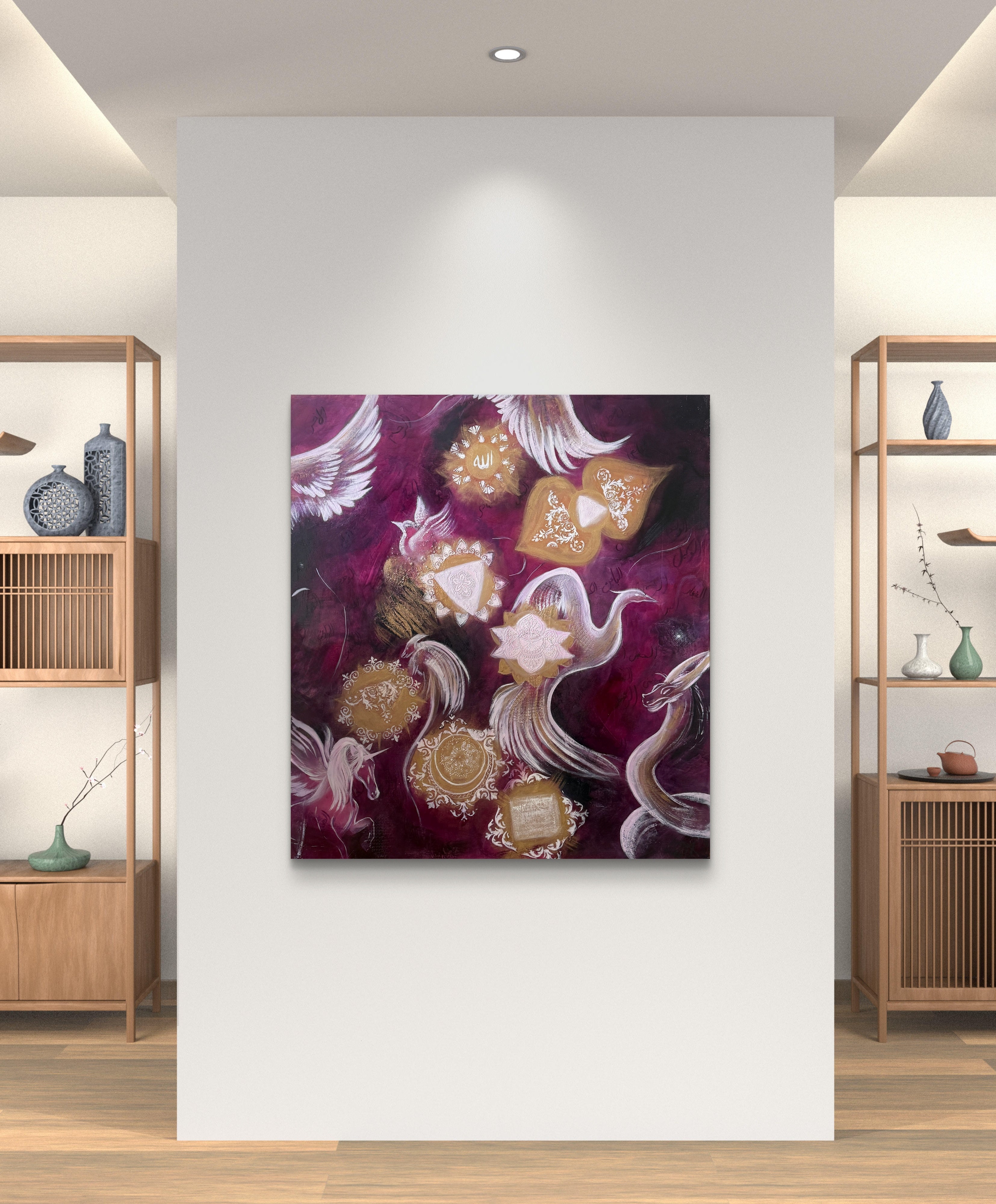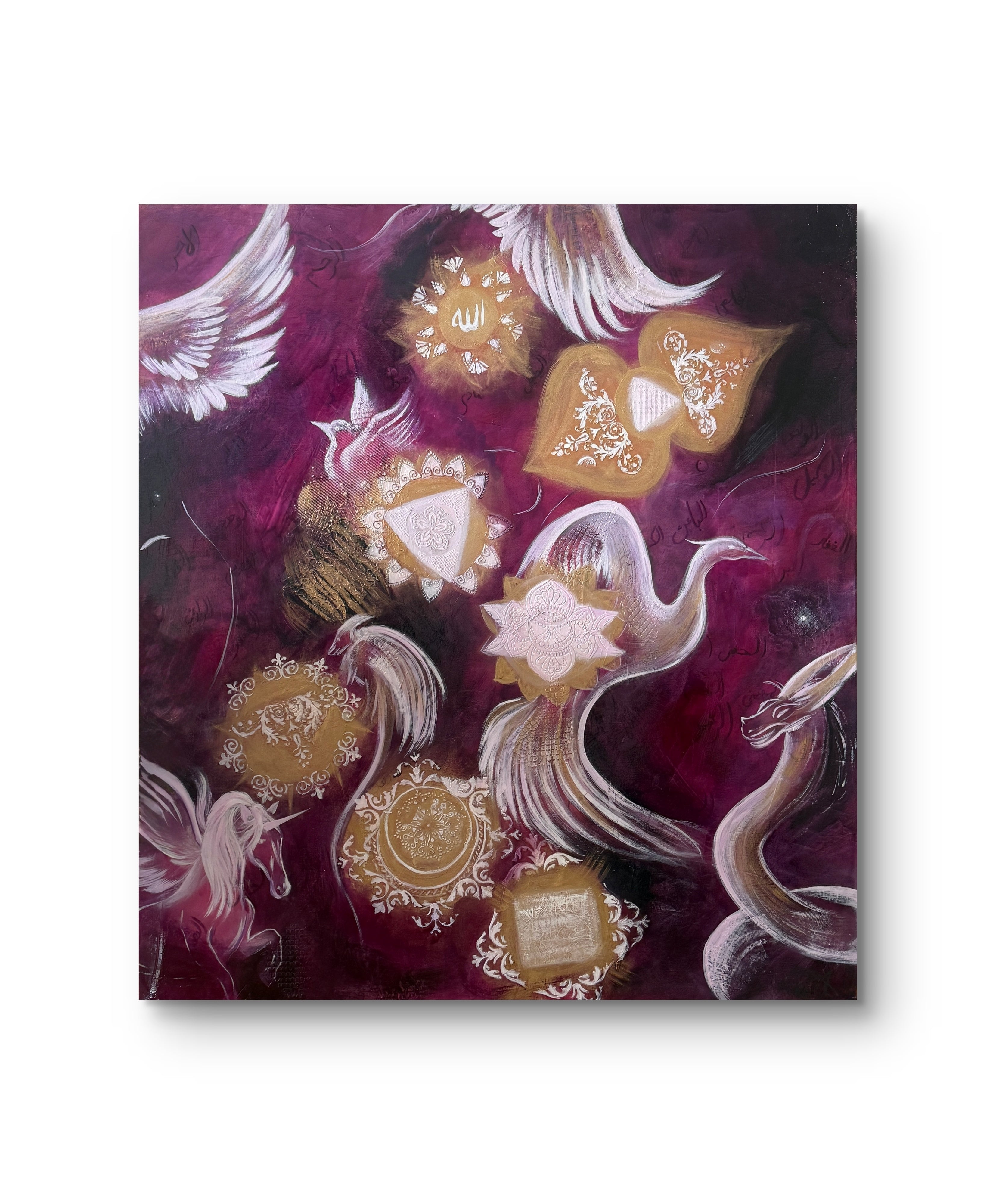 Seven Heavens is a multicultural symbolic painting inspired by the seven chakras. Each chakra is represented through detailed oriental-patterned mandalas surrounded by spirit animals that reflect harmony and divine presence. Some of the 99 Attributes of God are delicately inscribed in the background, merging spiritual and cultural symbolism. The entire scene rests on a luminous magenta background that embodies love as a universal essence connecting all beings. “Seven Heavens” celebrates unity, balance, and the sacred beauty found in diversity.